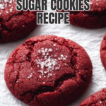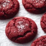 Delicious homemade red velvet cookies featuring a perfect balance of cocoa and vanilla flavors, rolled in vibrant red sanding sugar for a festive and flavorful treat. These cookies have a soft, slightly underbaked center and crisp edges, making them an irresistible dessert for any occasion.