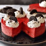 A rich and creamy Christmas Red Velvet Oreo Cheesecake featuring a chocolate sandwich cookie crust, velvety red velvet cheesecake filling, and a perfect balance of cocoa and vanilla flavors. This festive dessert is baked in a water bath for a smooth texture and topped with whipped cream for an elegant finish.