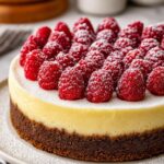 - Decorate and Serve: Remove the cheesecake from the fridge and release the pan ring. Spread the ricotta topping evenly over the cheesecake. Decorate with raspberries, strawberries, chocolate chips, or your preferred toppings. Slice and serve.