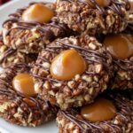 These Salted Caramel Turtle Thumbprint Cookies are rich chocolate cookies with a crunchy pecan coating, filled with gooey salted caramel and drizzled with melted chocolate. A perfect sweet and salty treat that combines buttery chocolate dough, caramel, and nuts in every bite.