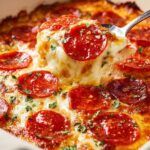 This Pizza Dip is a creamy, cheesy appetizer perfect for pizza lovers. It combines softened cream cheese and sour cream with classic Italian herbs and a generous layer of marinara sauce, Parmesan, mozzarella, and pepperoni. Baked until bubbly and golden, it's served warm with crusty bread or chips for dipping, making it an irresistible crowd-pleaser at parties or game day.