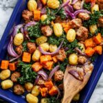 A flavorful and easy sheet pan meal featuring roasted butternut squash, savory sausage, tender gnocchi, and kale, all drizzled with a tangy miso-cider sauce for a delicious weeknight dinner.