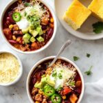 - Serve with toppings: Spoon the chili into bowls and top with desired optional toppings such as green onions, shredded cheese, avocado, or sour cream/Greek yogurt.