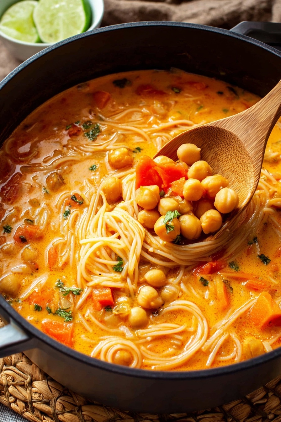 This Thai Red Curry Soup is a vibrant and creamy dish packed with warm spices, fresh vegetables, and comforting coconut milk. Featuring tender chickpeas and rice noodles, it offers a wholesome and satisfying meal that's easy to prepare in under 30 minutes, perfect for a cozy weeknight dinner.