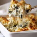 This Spinach and Artichoke Pasta Bake is a creamy, cheesy casserole perfect for a comforting meal. Combining tender rigatoni pasta with sautéed onions, garlic, fresh baby spinach, and artichoke hearts in a luscious cream cheese and pecorino sauce, it’s topped with mozzarella and baked until golden and bubbly for a delightful dinner.