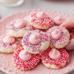 Strawberry Kiss Cookies are soft, funfetti sugar cookies infused with cream cheese and topped with iconic Hershey’s Strawberry Ice Cream Cone Kisses for a delightful burst of strawberry flavor. These cookies feature a tender texture and a playful pop of pink sugar coating, perfect for celebrations or anytime you crave a sweet treat.