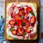 - Assemble the cake: Spread the cream cheese buttercream evenly over the cooled cake. Dollop more strawberry sauce on top and swirl it gently for a decorative effect. Garnish with fresh strawberries and dried rose petals.