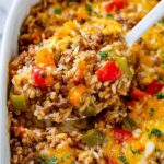 - Assemble the Casserole: Transfer half of the meat mixture into a baking dish. Layer with half of the cooked brown rice, diced bell peppers, diced onion, and half of the shredded cheddar cheese. Repeat the layers with the remaining ingredients.