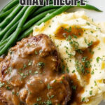 This steak with gravy recipe features a juicy top sirloin, strip steak, or ribeye perfectly seared and smothered in a rich, flavorful homemade gravy made from beef broth, white wine, garlic, and aromatic spices. Ideal for an indulgent dinner, the steak is rubbed with a savory blend of spices before searing, then gently cooked in a skillet with the gravy to develop deep flavors. Serve this classic steak with mashed potatoes and roasted green beans for a comforting meal.