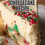 This Sugar Cookie Cheesecake combines a buttery sugar cookie crust with festive Christmas sprinkle cookie dough balls baked inside a creamy cheesecake, topped with a smooth white chocolate ganache. Perfect for holiday celebrations and dessert lovers seeking a fun and flavorful twist on classic cheesecake.