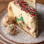 This Sugar Cookie Cheesecake combines a buttery sugar cookie crust with festive Christmas sprinkle cookie dough balls baked inside a creamy cheesecake, topped with a smooth white chocolate ganache. Perfect for holiday celebrations and dessert lovers seeking a fun and flavorful twist on classic cheesecake.