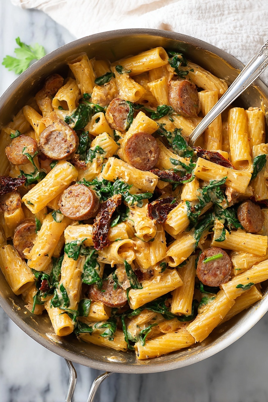 This Sun-Dried Tomato Pasta combines sweet Italian sausage with a creamy, flavorful sauce enriched by sun-dried tomatoes, Parmesan, and spinach. It's a comforting and savory dish perfect for a hearty dinner, blending robust Italian flavors with a smooth texture.