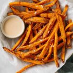 Crispy oven-baked sweet potato fries served with a rich and creamy toasted marshmallow dip. This sweet and savory side dish combines the natural sweetness of perfectly roasted sweet potatoes with a unique, indulgent marshmallow dipping sauce that’s toasted to perfection for a slightly caramelized flavor.