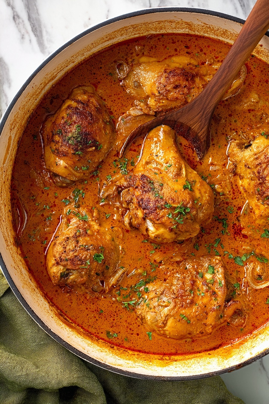Return the browned chicken and any juices on the plate back into the pot. Bring everything to a gentle simmer, cover with the lid, and cook for 30 to 35 minutes. During this time, the chicken becomes incredibly tender while absorbing all the gorgeous paprika and onion flavors mingling in the sauce.