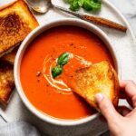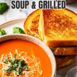 Classic Tomato Soup paired with a melty Grilled Cheese sandwich makes a comforting and satisfying meal perfect for any day. The rich tomato soup is creamy and smooth, served alongside a crispy, golden grilled cheese with white cheddar and mozzarella.