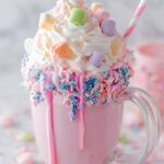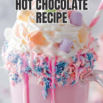 A whimsical and colorful Unicorn Hot Chocolate made with creamy whole milk, white hot chocolate mix, and a touch of pink food coloring, topped with whipped cream, sprinkles, and marshmallows for a magical treat perfect for any occasion.