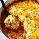 This Unstuffed Peppers recipe is an easy and flavorful one-skillet meal featuring ground beef, sausage, rice, bell peppers, and melted cheddar and Monterey Jack cheese. Perfect for a family-friendly weekday dinner, this dish combines savory meat, aromatic spices, and a rich tomato sauce topped with gooey cheese and fresh parsley.