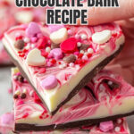 A festive Valentine’s Day Chocolate Bark featuring layers of rich dark chocolate, creamy white chocolate, and vibrant pink candy melts, topped with colorful Valentine’s Day candies and sprinkles. Perfect for gifting or sharing during the holiday.