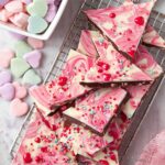 A festive Valentine’s Day Chocolate Bark featuring layers of rich dark chocolate, creamy white chocolate, and vibrant pink candy melts, topped with colorful Valentine’s Day candies and sprinkles. Perfect for gifting or sharing during the holiday.