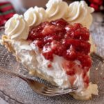 White Christmas Pie is a festive and creamy dessert featuring a tender homemade pie crust filled with a fluffy coconut and gelatin-based filling, topped with whipped cream and fresh strawberries for a perfect holiday treat.